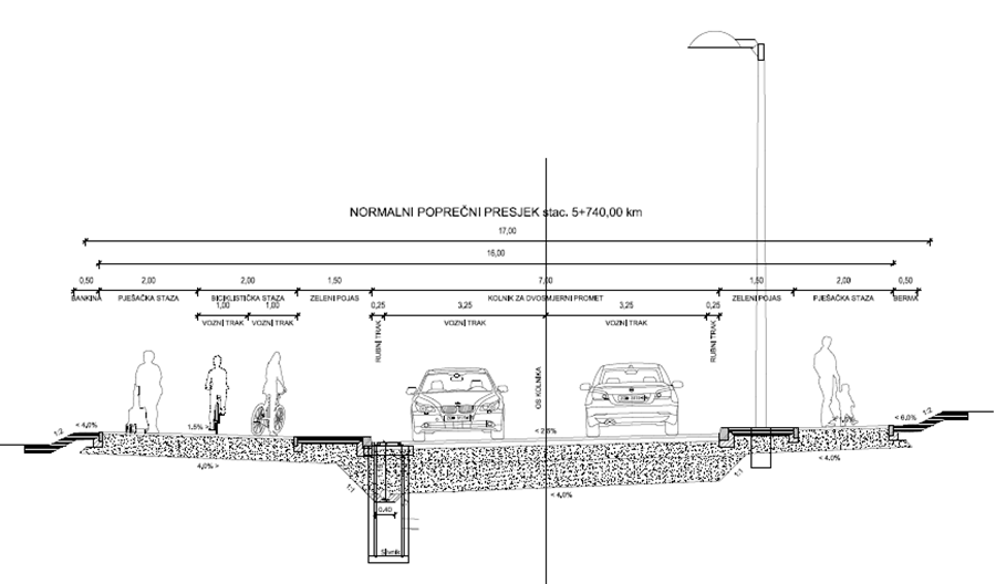 Prometni profil županijske ceste čine kolnik za dvosmjerni promet s trakama širine 3,50 metra, pješačko-biciklistička staza širine od 3,50 do 4,00 metra te pješačka staza širine od 1,50 do 2,00 metra. Pješačko-biciklističke i pješačke površine odvojene su od kolnika zelenim pojasom širine od 1,00 do 1,50 metar.